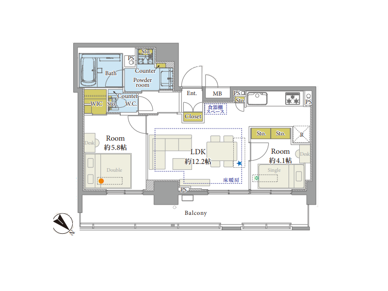 メインとなるLDKは約12.2帖の広さ。広すぎずコンパクトすぎない絶妙なサイズ感で、ソファやダイニングテーブルを配置してもゆとりあるレイアウトが叶います。床暖房が備わっているため、寒い季節でも足元からじんわりと暖かさを感じられるのが嬉しいところ。床に近い位置で過ごすことの多いペットにとっても、心地よく過ごせる空間です。