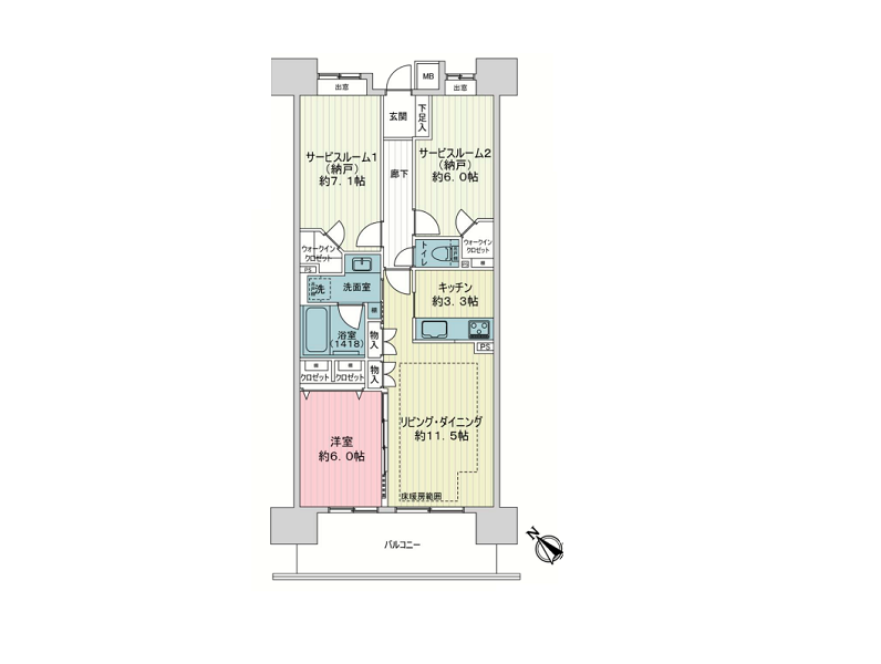 約7.1帖と約6.0帖の2つのサービスルームを備えたゆとりあるプラン。広さに余裕があるため、寝室や書斎など洋室感覚で使えます。各部屋にウォークインクローゼットを完備しており収納力は抜群。採光は控えめですが窓付きのため、空気の入れ替えに困ることはありません。