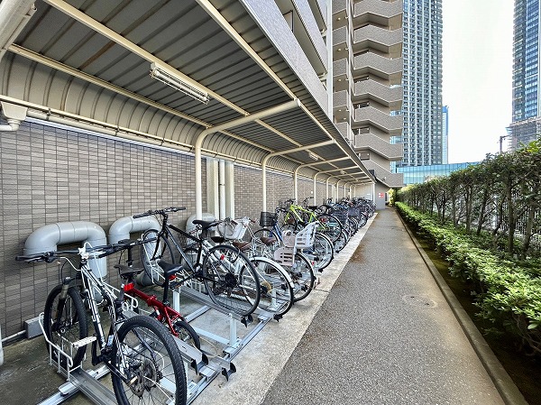 アプローチの奥には駐車場が。収納効率の良い立体駐車場を採用。駐輪場はマンションの裏手に設けられていました。屋根付きなので、雨風にダイレクトに晒されることはありません。また、車両の出口はアプローチとは別に設けられているため、接触などのトラブルを避けられそう。