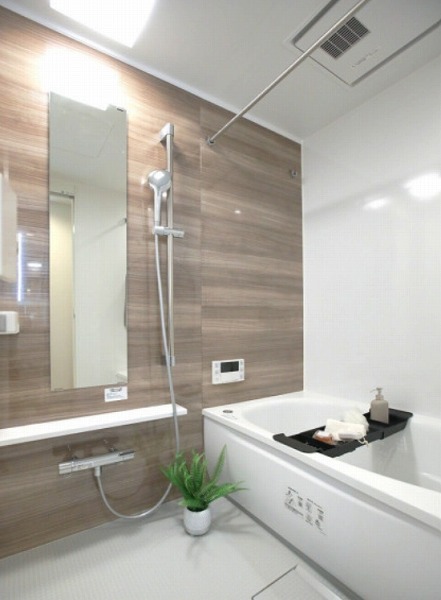 木目調パネルがやさしい印象を与えるバスルーム。追い焚き機能付きのバスタブで、好きなタイミングに快適な入浴を楽しむことが。ワンタッチでお湯を温め直せるため、長風呂派の方にも嬉しい仕様。1日の疲れをゆっくり癒せるバスルームですよ♪