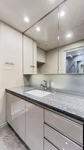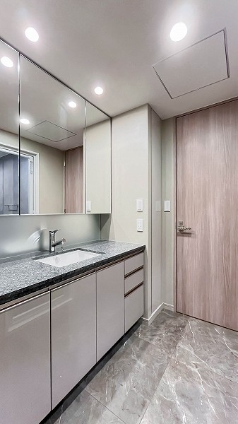 シックなグレーデザインの独立洗面化粧台が、落ち着きのあるモダン空間を作り出します。広いカウンターで朝の支度や小物の整理もラクラク。快適な使い心地で毎日の身支度をサポートしてくれますよ♡