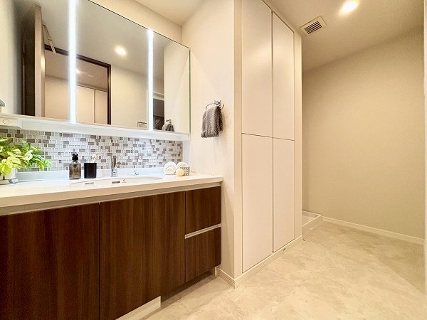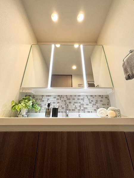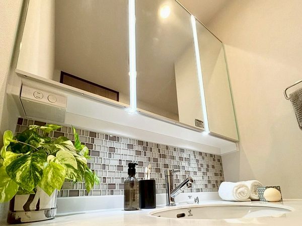 モザイクタイルがさりげなく彩る洗面化粧台は、清潔感の中に遊び心を感じるデザイン。3面鏡仕様で角度を変えながらチェックでき、LEDライトが自然な明るさを演出します。忙しい朝もスムーズに身支度がこなせそう♩