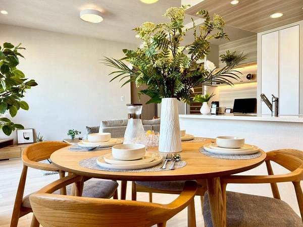 メインとなる約15.5帖のリビングとダイニングは、L型設計でリビングとダイニングをゆるやかに分けられるレイアウト。食事の時間とくつろぎの時間、それぞれを心地よくお過ごしいただけます。ホワイト基調に木目が映える内装はどんな家具も合わせやすく、自分らしいインテリアづくりが楽しめそう♥