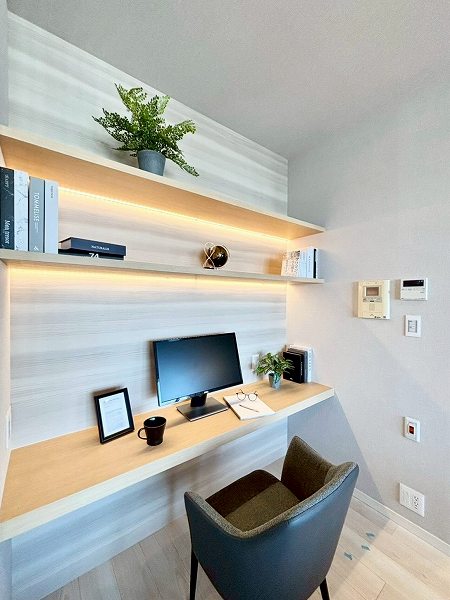カウンターとウォールシェルフを備えたワークスペース。チェアを置けばすぐにPC作業が始められる設えです。コンセントも用意されているため、配線に困る心配もありません。在宅ワークや読書、趣味の時間にも活躍しそう。暮らしの中に、ほどよく集中できる居場所があるのは嬉しいですね。