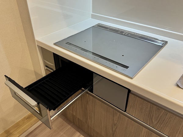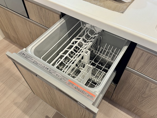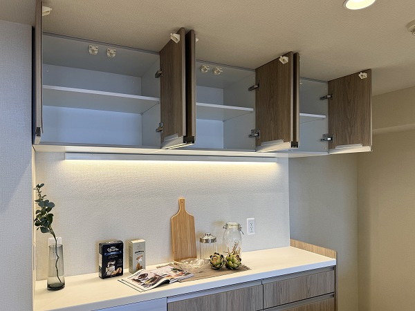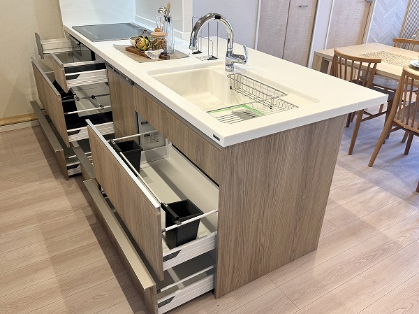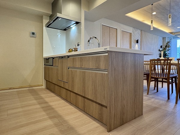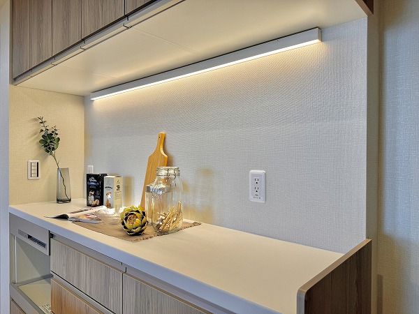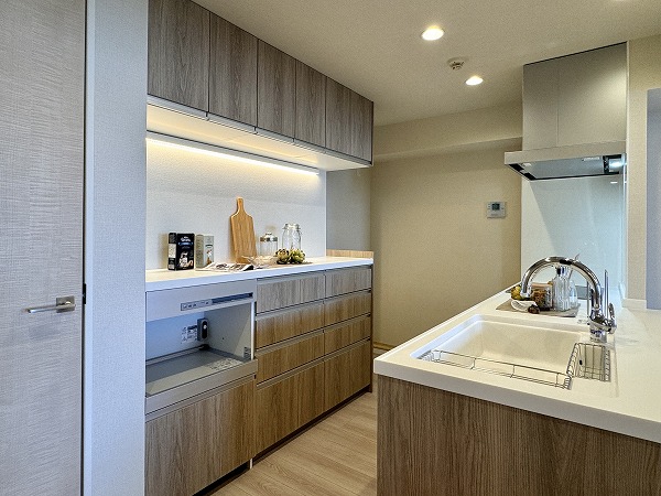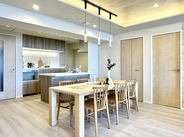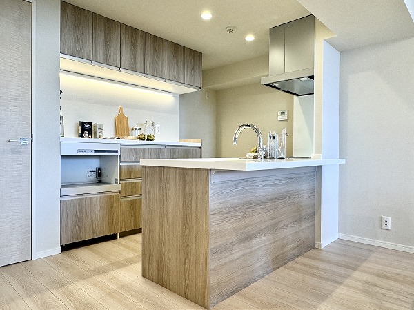 木目のデザインが室内の雰囲気と優しく溶け合う爽やかなキッチン。対面カウンターなので、料理中に家族との会話を楽しんだりペットを見守ったりできる安心感があります。背面には収納力抜群のカップボードを備えており、キッチンまわりをすっきりキープ◎