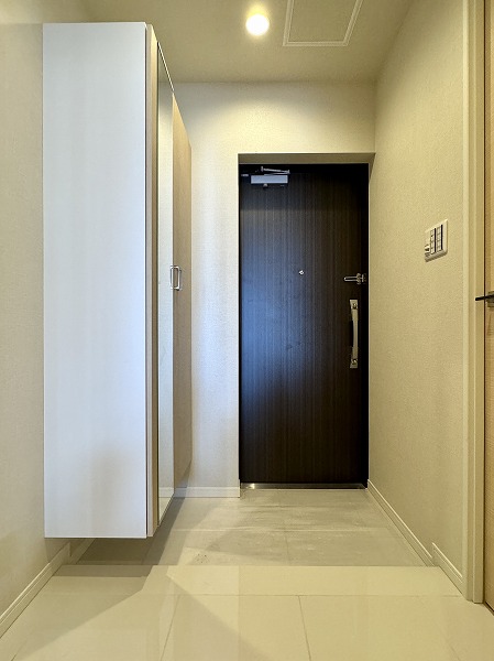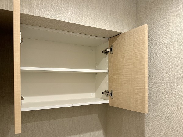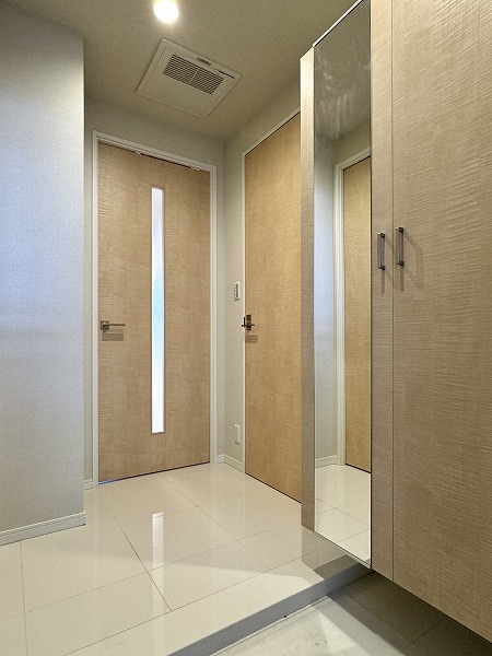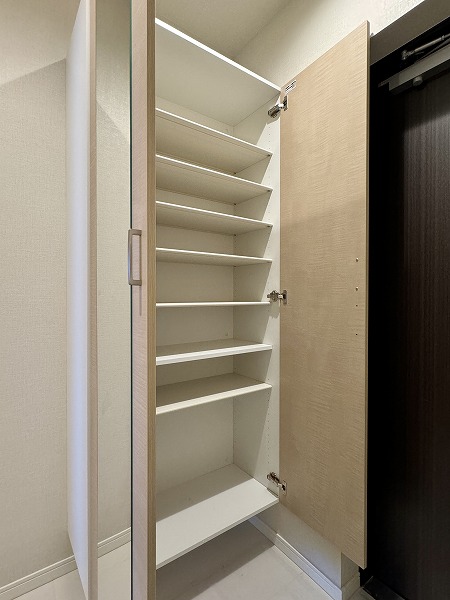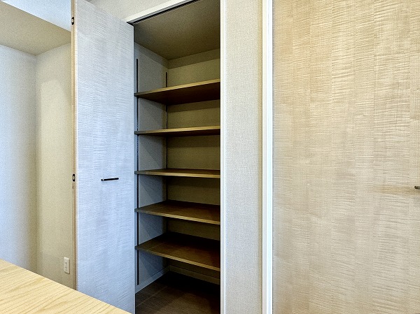 玄関を入ってすぐの場所には、大容量のマルチウォークインクローゼットが設置されています。棚の高さを自由に調整できるため、季節物の収納から日用品のストックまで、効率よく整理できる使い勝手の良さが魅力です♪
