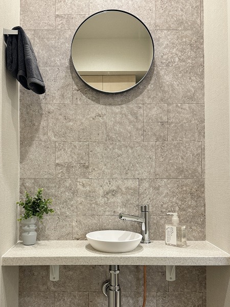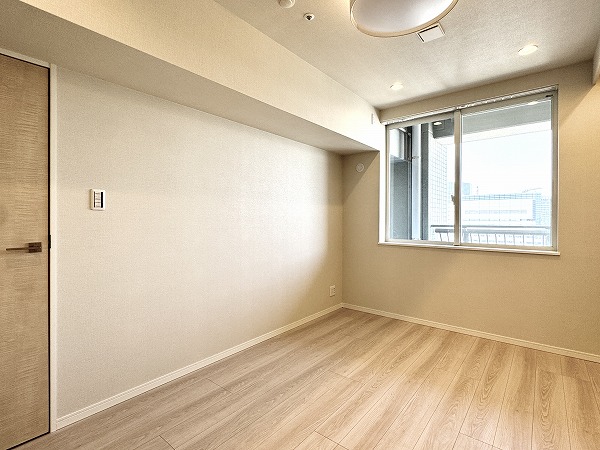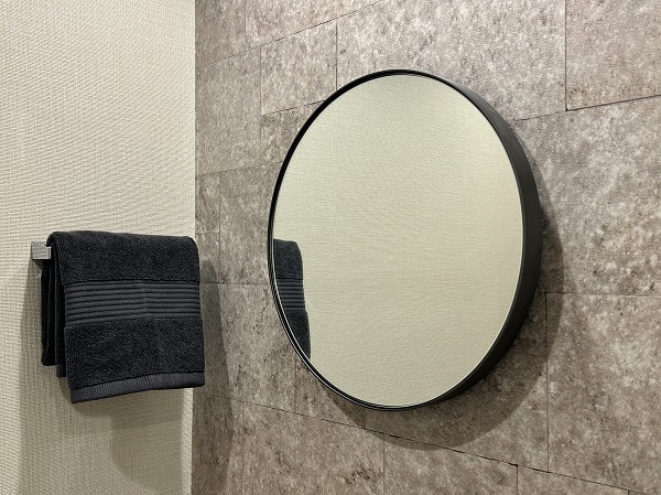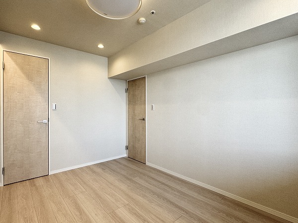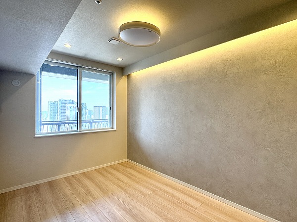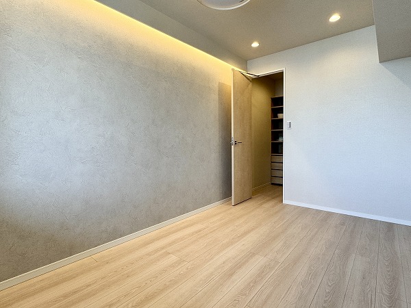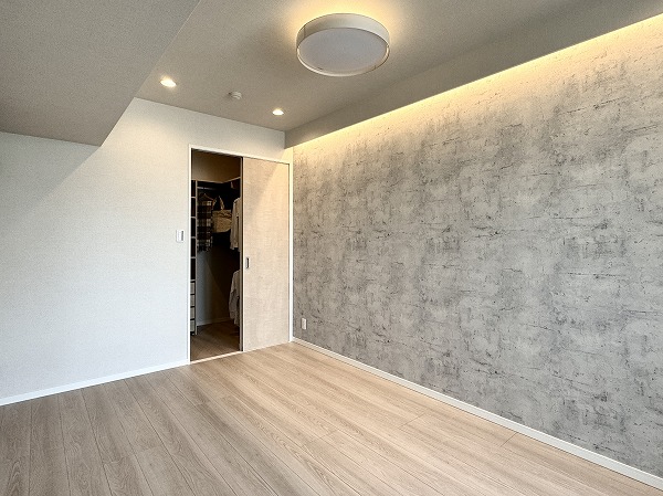 各洋室には異なるテイストのグレー系アクセントクロスを採用。約6.7帖の洋室にはモルタル調のクロスが取り入れられ、落ち着いた中にも個性が感じられる大人っぽい空間が広がっていました。