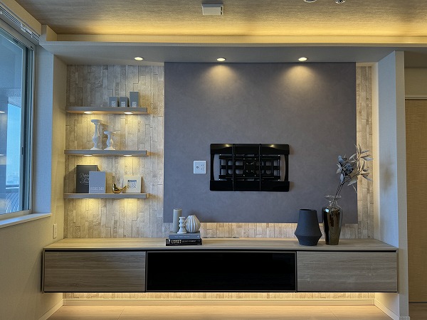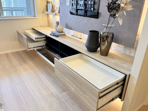 リビングの一角には造作のワークカウンターがあり、ヘリンボーンのクロスが上品なアクセントに。仕事や趣味の作業スペースとして使いやすく、レイアウトの自由度も高いのが魅力です。