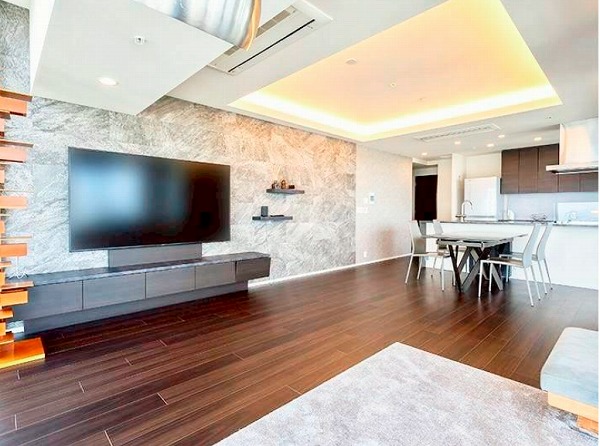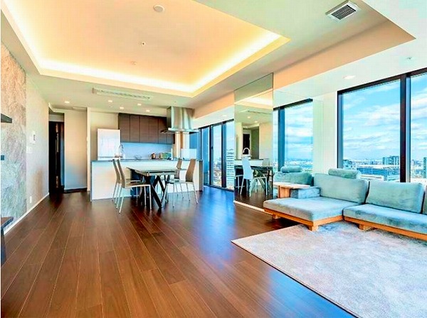 約29.7帖を誇るメインルームは、家具の配置に悩むことのないゆとりある広さ。シンプルで洗練された内装は、モダンからナチュラルまで幅広いインテリアと好相性◎南東向きのガラスウォールからは開放的な景色が広がり、日中は照明が不要なほどの明るさを確保していました。