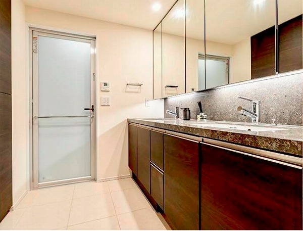 サニタリールームは水回りを集約し、家事動線もスムーズに。2ボウル洗面化粧台のおかげで、家族それぞれのペースを崩すことなく身支度が整います。時間に追われがちな毎日でも、余裕を感じられる設計ですね。