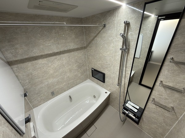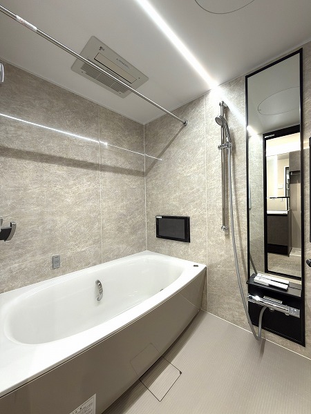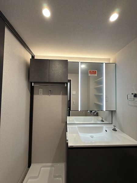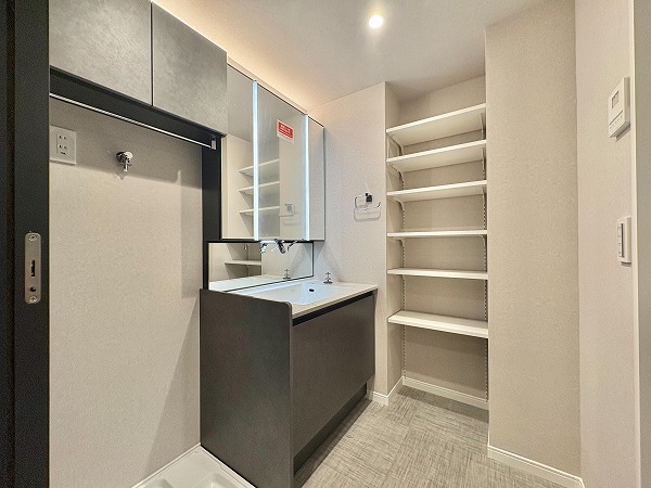 サニタリールームには洗面台・洗濯機置き場・バスルームが集結しています。水回りの機能がまとまっていると、家事動線もスムーズですよね。清潔感溢れるバスルームには快適なご入浴に欠かせない追い焚き機能&浴室乾燥機を搭載。
