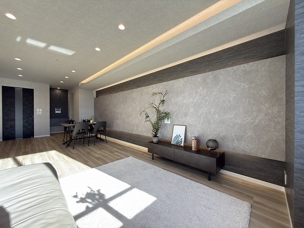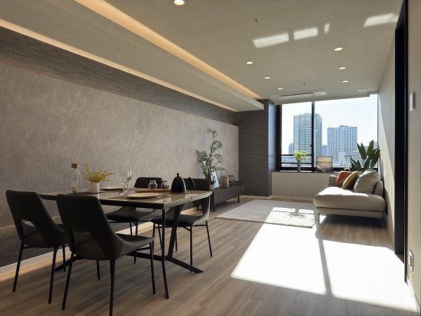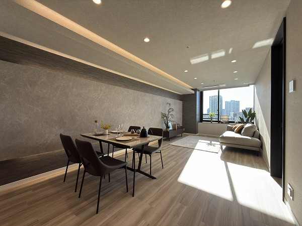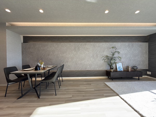 メインとなるのは、約18.0帖のリビングダイニング。便利な床暖房とビルトインエアコンを搭載しています。さらには超広調色ダウンライトが採用されているので、時間帯や気分に合わせて光の色を自由に調整できます。
