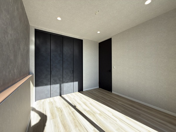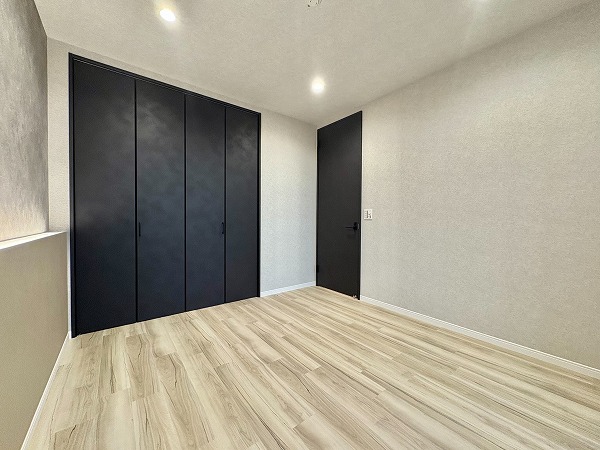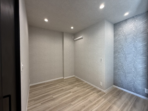 手前にあるのは、4.3帖の洋室。こぢんまりとしたサイズのお部屋ですが、クローゼット付きで衣裳部屋としてもお使いいただけそう。シンプルな内装デザインも魅力です。