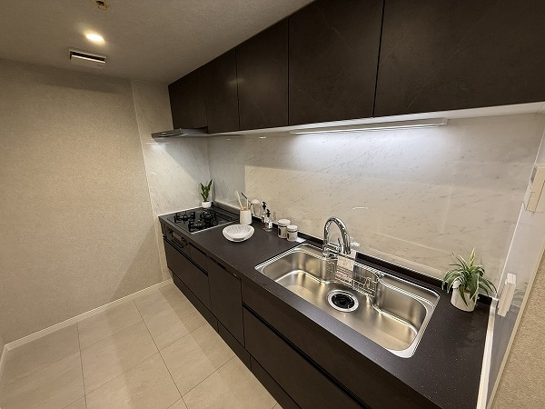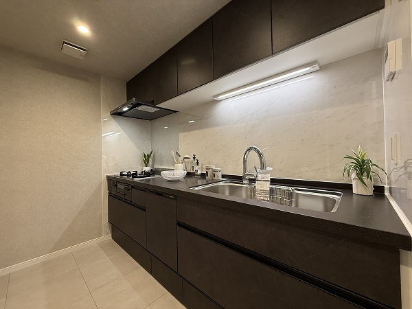 おおよそ4.1帖のキッチンスペースには、使い勝手の良いシステムキッチンを完備しています。複数品の同時調理が可能なグリル付き3口コンロ&便利な食洗機が備わっているので、毎日の家事もスムーズにはかどりそう♪