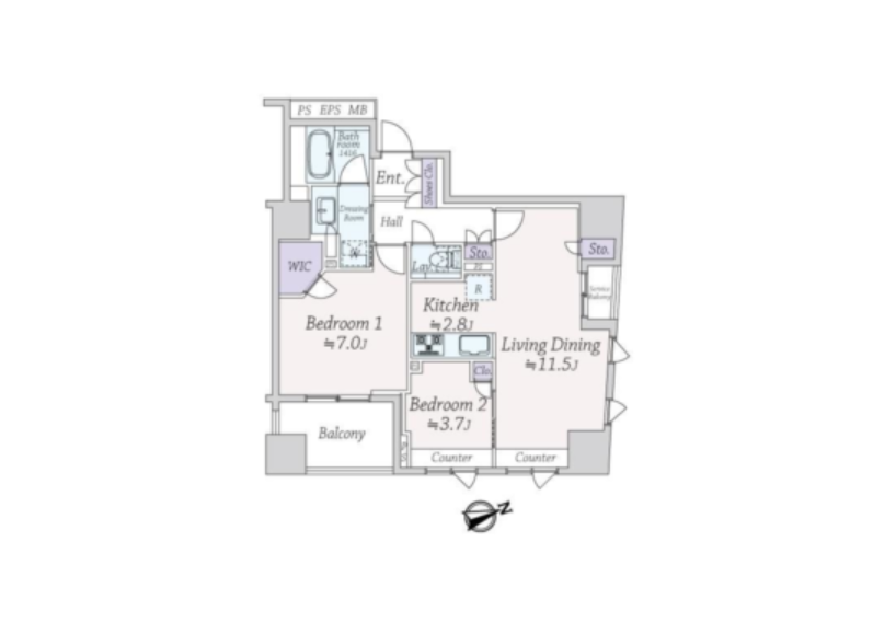 居室は約7.0帖と約3.7帖の2部屋構成。主寝室として使いやすい広さの洋室に加え、もう一室はワークスペースや収納、趣味部屋など多用途に活用できるサイズ感です。プライベート空間をしっかり確保できる点も魅力と言えるでしょう。