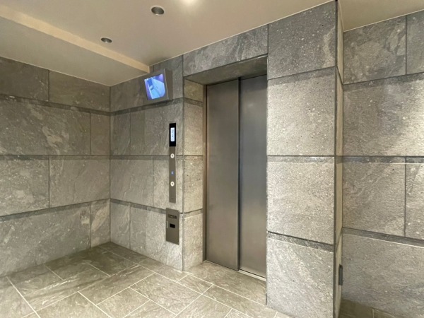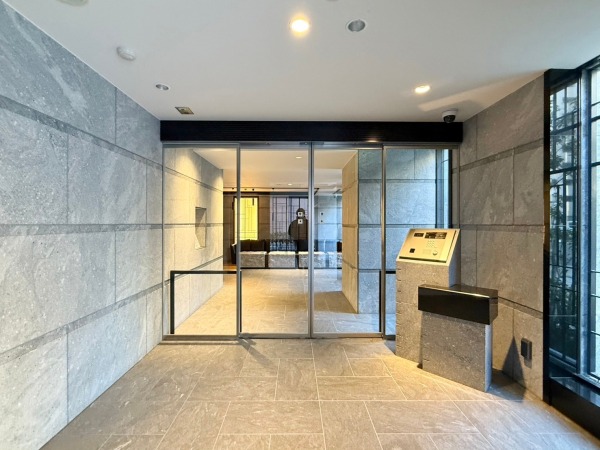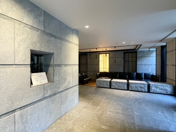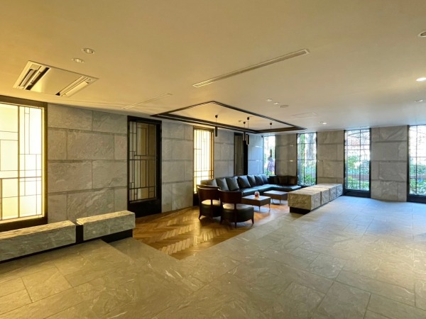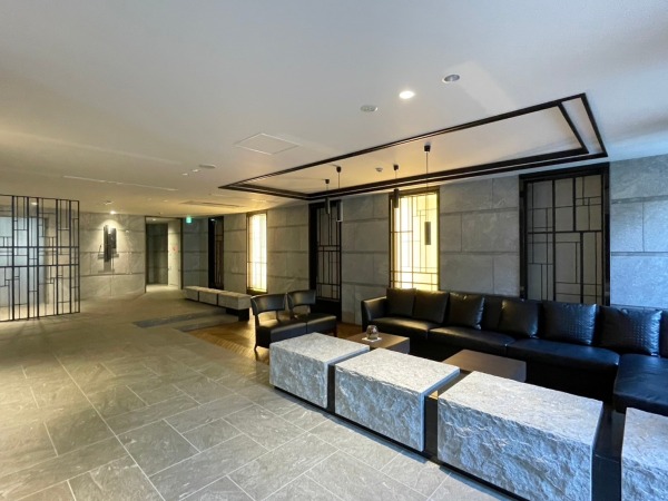 オートロックを抜けると、御影石があしらわれたエントランスホールが広がります。落ち着いた質感が空間に重厚感をもたらし、上質な雰囲気が感じられました!ソファ&テーブルも設置されており、待ち合わせやちょっとした会話の場として利用できそうです。