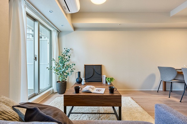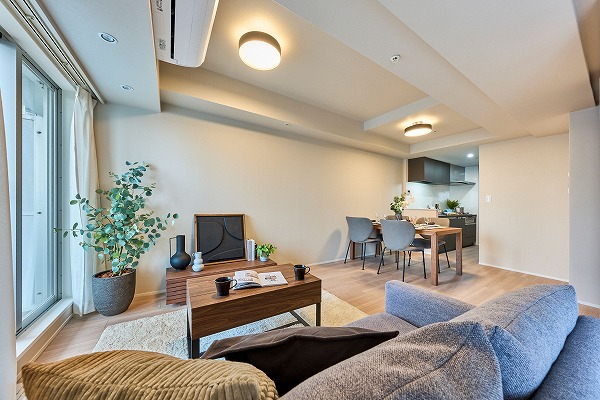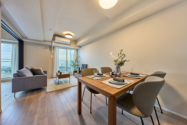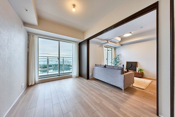 専有面積73.03㎡の室内はリノベーションにより美しく一新され、新築のような清潔感に包まれています。約10.1帖のリビングダイニングは縦長の形状で、ダイニングとリビングを分けたレイアウトがしやすい設計。床暖房が備わっており、寒い季節でも足元から暖かく、ペットにもやさしい空間です。隣接する約5.6帖の洋室はスライドドア仕様となっており、開放すればリビングと一体の広々空間としても活用可能。キッズスペースとして使えば家事をしながら見守れるのも嬉しいポイント。