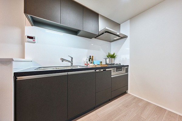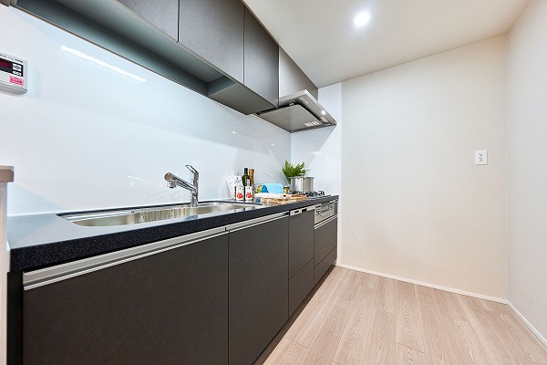 キッチンは奥まった位置に設けられ、生活感を抑えられるレイアウト。さらにキッチンにも床暖房が備わっており、冬場の調理も快適です。食洗機も完備されているため、後片付けの負担を軽減してくれますよ◎