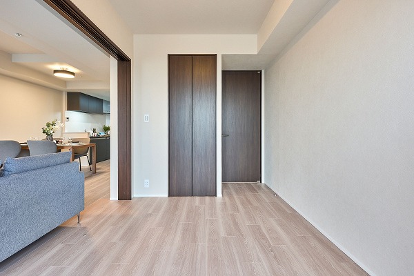 メインルームに隣接する約5.6帖の洋室は、スライドドアで仕切られた使い勝手の良い空間。扉を開放すればリビングと一体化し、より開放的に活用できます。キッズスペースとして利用すれば、家事をしながらお子様を見守ることも可能。
