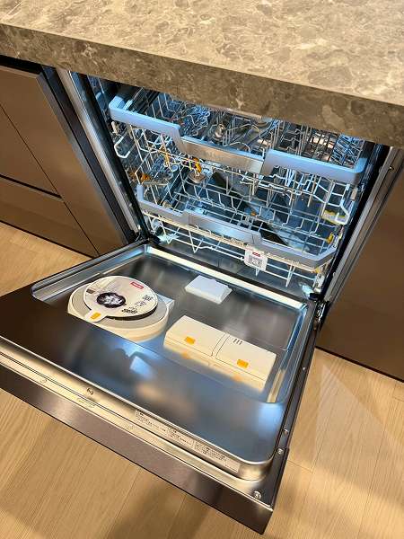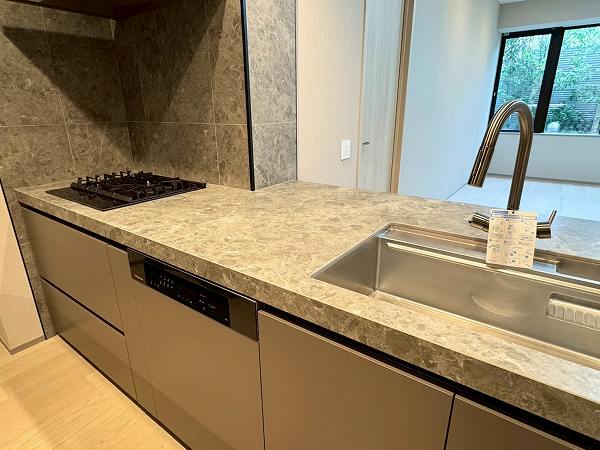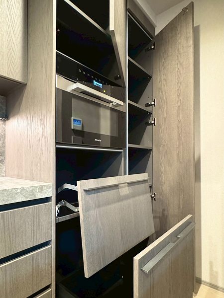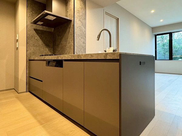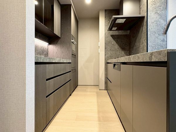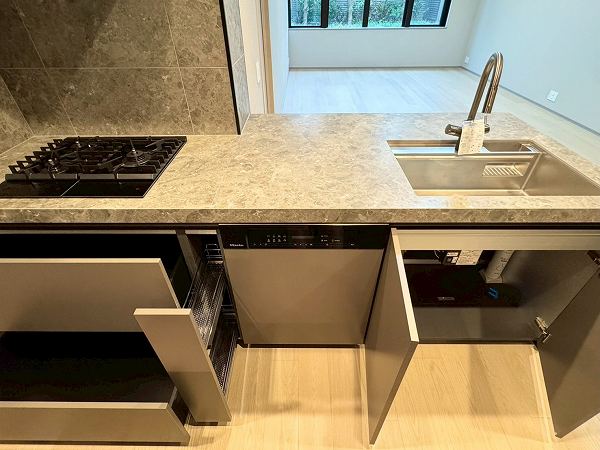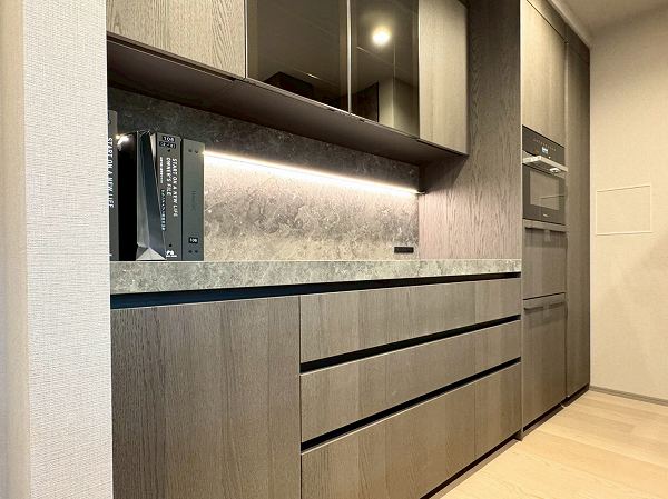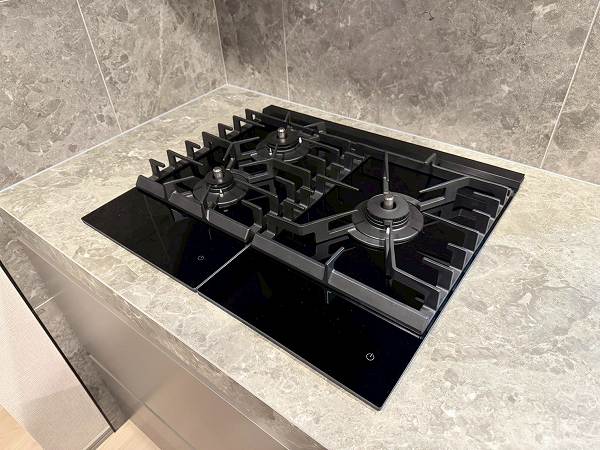 キッチンのカップボードにはビルトインオーブンを備え、本格的な料理も楽しめる充実した設備が整っています。グリル付きの3口コンロは同時調理もしやすく、日々の食事づくりからホームパーティーまで幅広く活躍してくれそう。後片付けは食洗機にお任せを♩