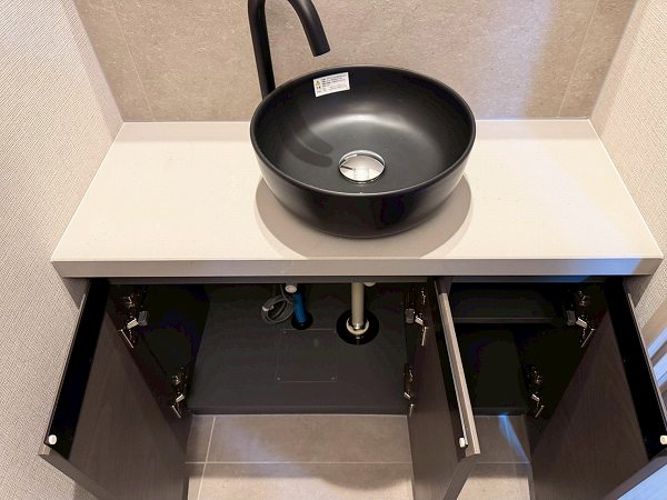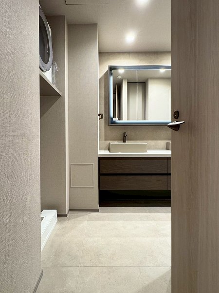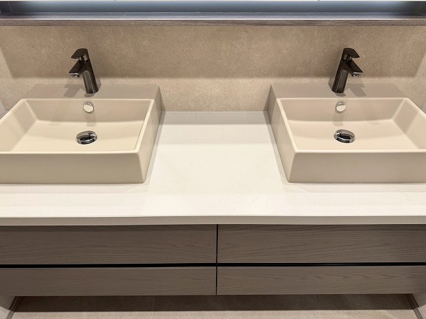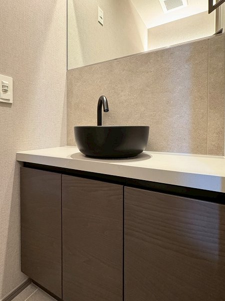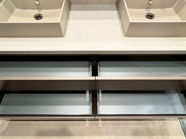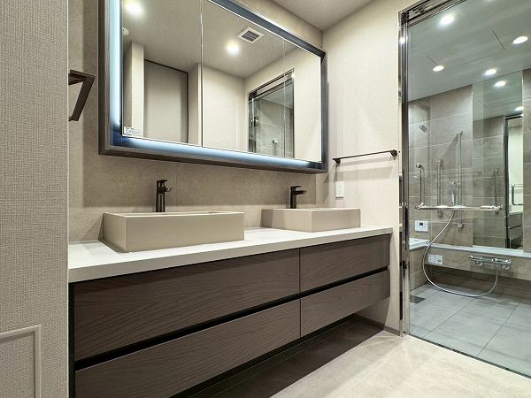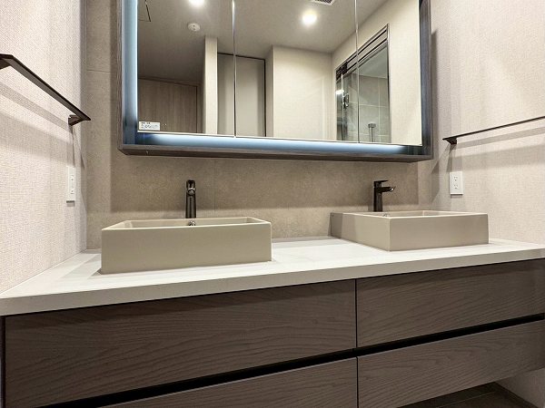 パウダールームには、ホテルライクなダブルボウルの洗面化粧台を採用。ベッセルタイプのボウルがカウンターの上に美しく並び、空間のアクセントに。2人並んで身支度ができるため、朝の準備の時間もゆったりと使えますね♩