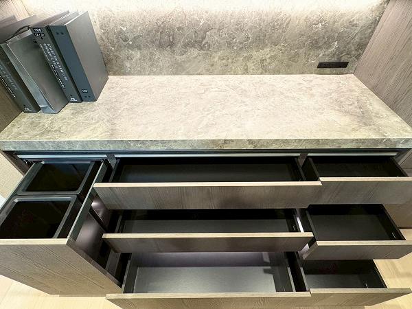 キッチンはブラックのMolteni&C製。ビルトインオーブンや3口コンロ、食洗器が揃っており、平日も休日も料理を楽しめそう。ホームパーティーを開いたら、リビングとのつながりを生かした動線でおもてなしもスマートに♩