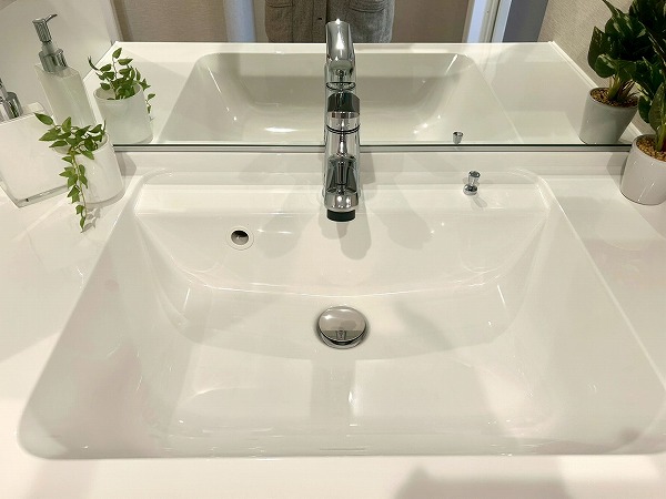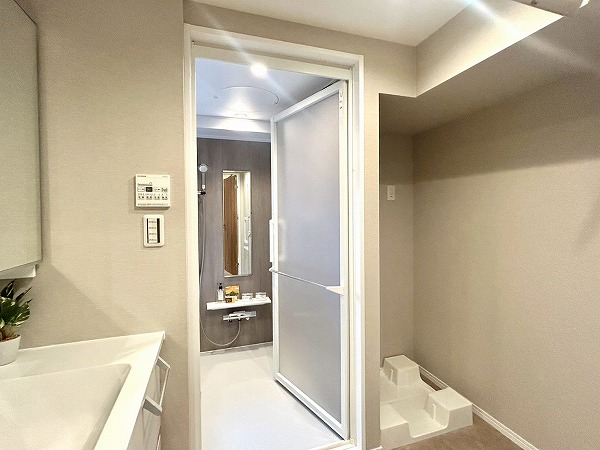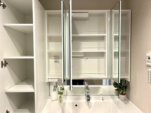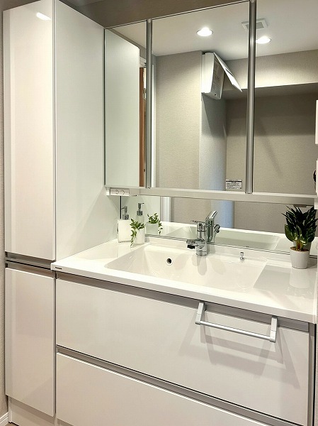洗面化粧台、洗濯機置き場、バスルームが一緒になったパウダールームは生活動線がスムーズで家事効率も上がりそう。洗面化粧台はたっぷり収納が可能で、日用品やタオルなどを収納できますよ。