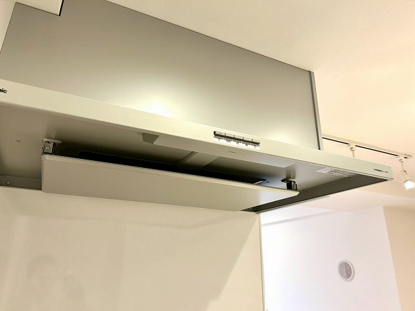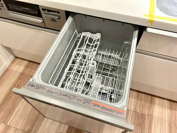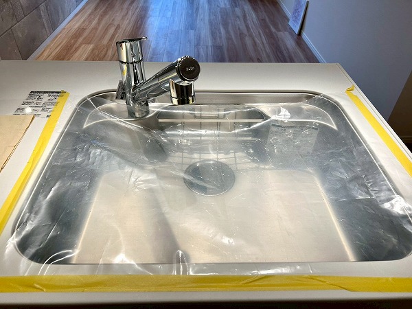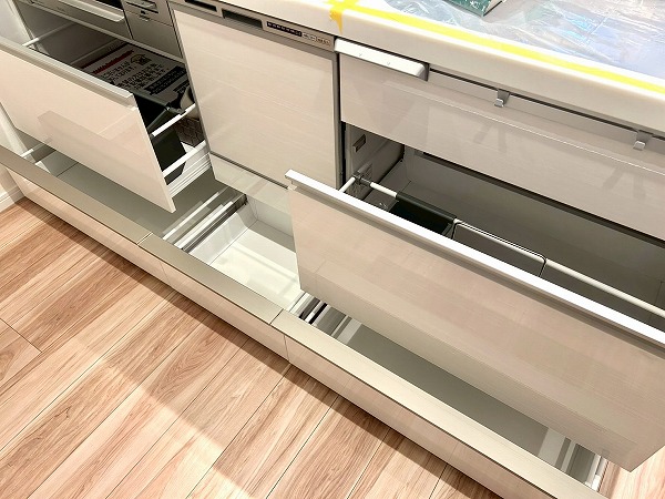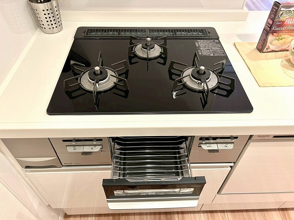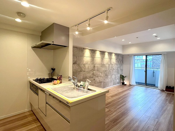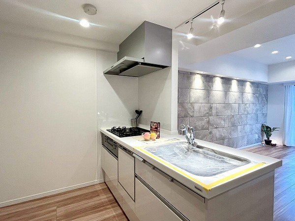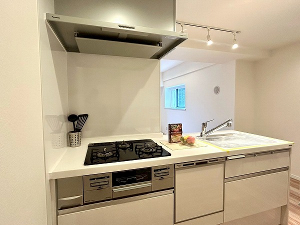 対面式のキッチンは家族や友人と会話を楽しみながらお料理ができます。白を基調としたデザインは清潔感を感じますね。キッチンスペースはゆとりがあり、冷蔵庫や追加で棚などを置いても良さそうです。
