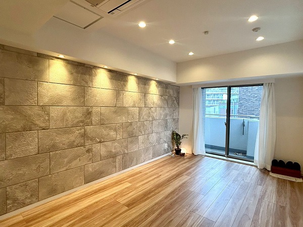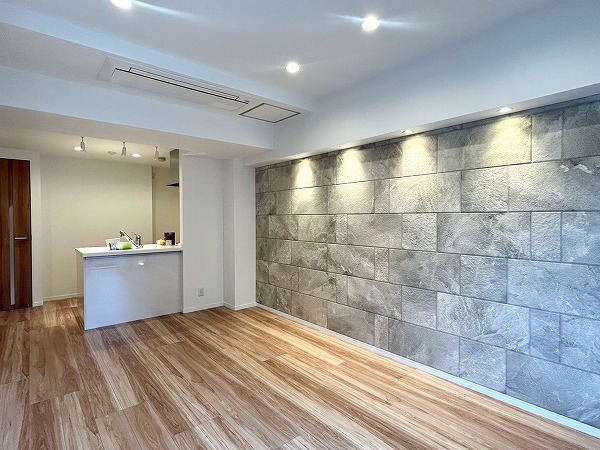 約13.4帖のリビングダイニングキッチンはゆとりのある広さで主要な家具をしっかり配置できそうです。ストーン調のアクセントクロスがお部屋をグッとお洒落空間に演出しています。