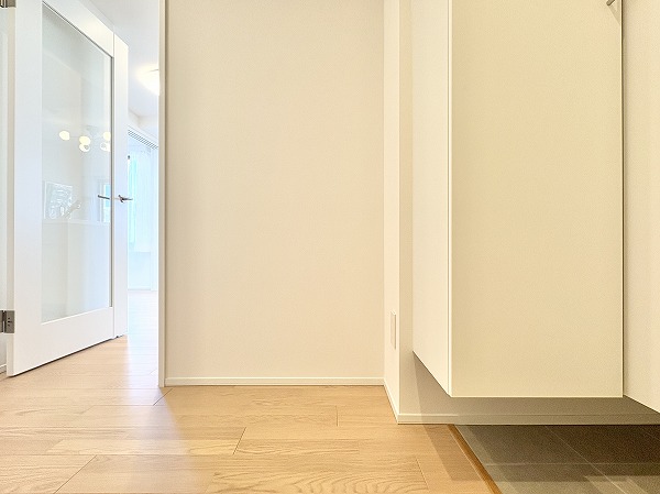 玄関はホワイト×グレーの色味からスタイリッシュな印象を受けました。収容力のあるシューズクローゼットが設けられていて、見た目だけではなく機能面も充実しています。収納が豊富なことにより、玄関周りを常にすっきりとした状態に保つことができそうです。
