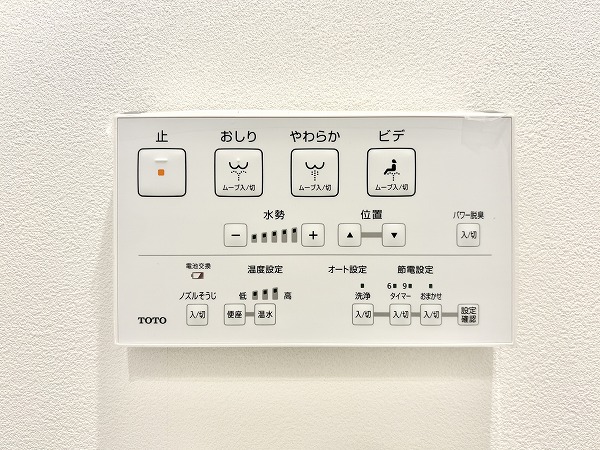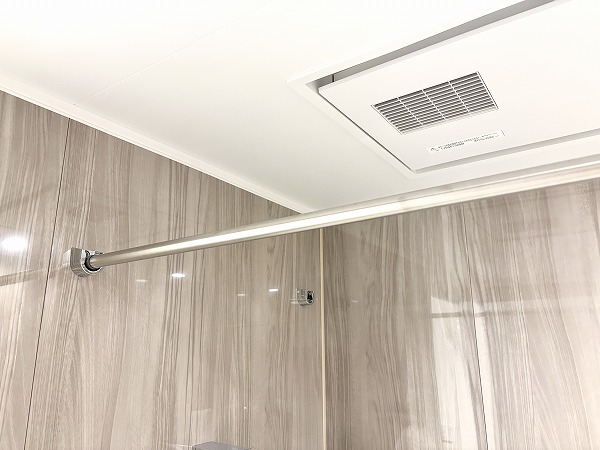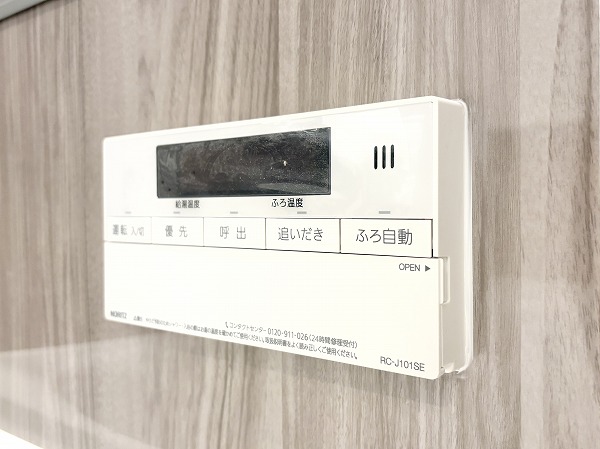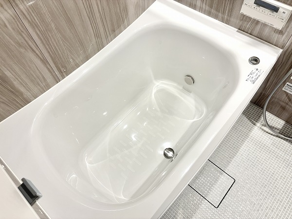 ブラウンのバスパネルから落ち着いた雰囲気を感じられるバスルーム。スライドバーでシャワーの位置を上下に動かせるので、どなたでも使用しやすいのが嬉しいですよね。追い焚き機能が搭載されており、好きなタイミングで快適なバスタイムを楽しめます。