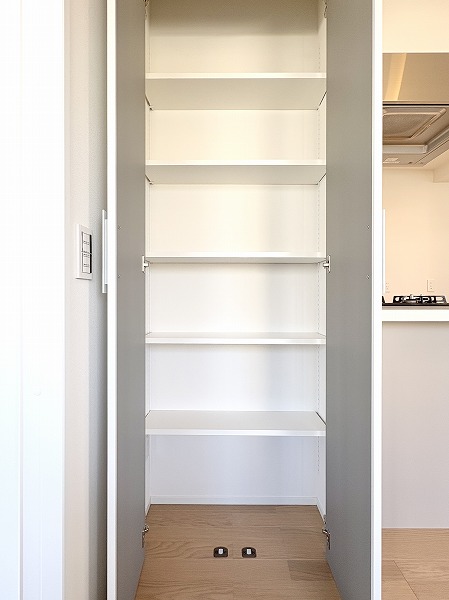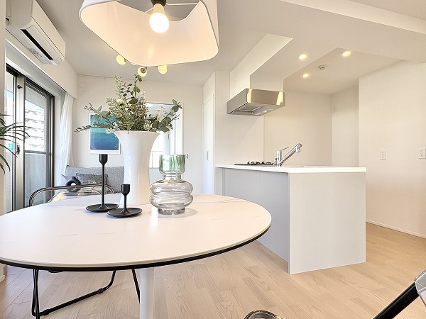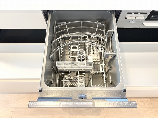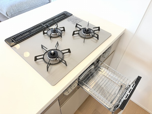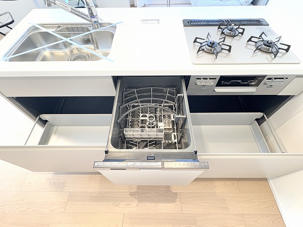 リビングダイニングの様子を見渡せる開放感たっぷりなオープンキッチン。リビングにいるご家族やゲストの方と楽しく会話しながら作業を進めることができますよ♪3口コンロ、グリル、食洗機付きで機能面も充実しているので、お料理好きな方にも満足していただけるのではないでしょうか。