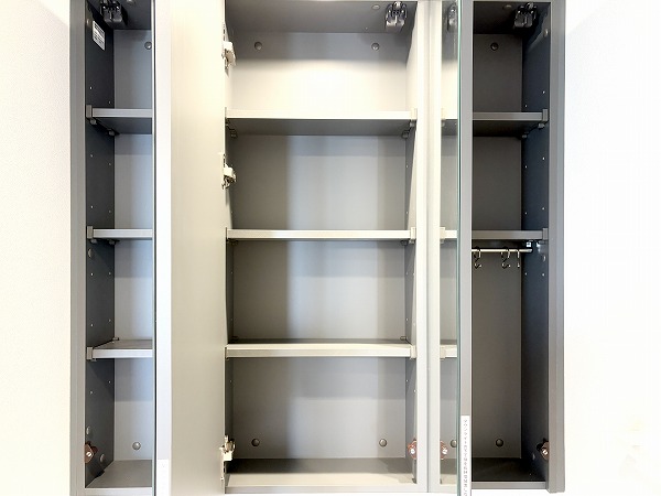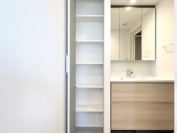 清潔感あふれる独立洗面化粧台。鏡裏、洗面台下に加え、横にも棚が設置されている収納スペースの豊富さが魅力的✿洗面ボウル横のカウンターにはゆとりがあり、化粧品などを置いておくことができるため、朝の身支度をスムーズにサポートしてくれます。ミラーキャビネット式でサイドや後頭部までサッと確認できるのが嬉しいですよね。