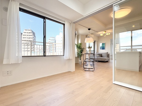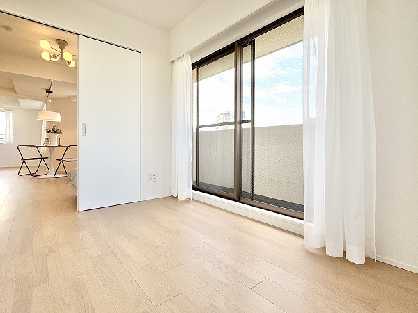 約3.7帖の洋室は、スライドドアでメインルームとの空間を分けることができます。クリアタイプなので、扉を閉めた状態でもリビングの光が差し込み明るく爽やかな空間に☀ナチュラルデザインな内装は、どんな家具やインテリアも合わせやすく自分好みのお部屋作りができますよ。