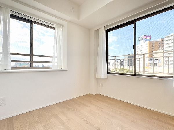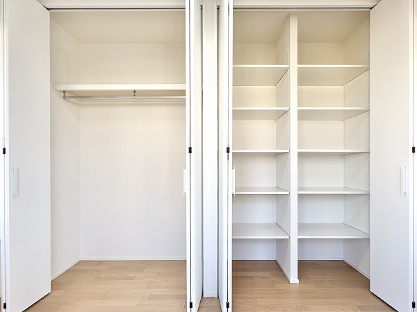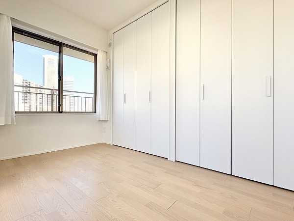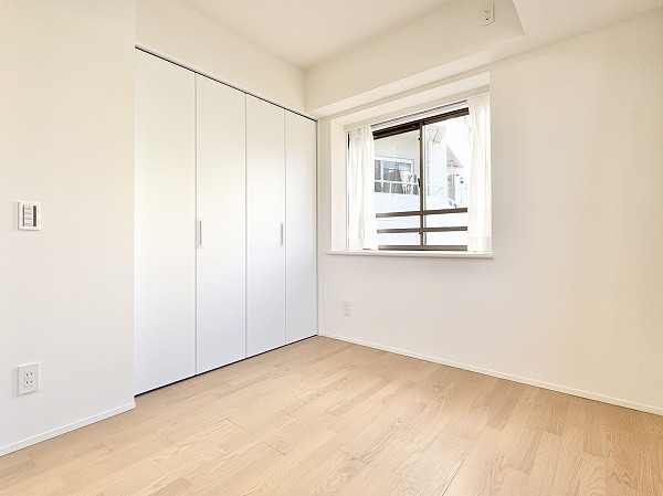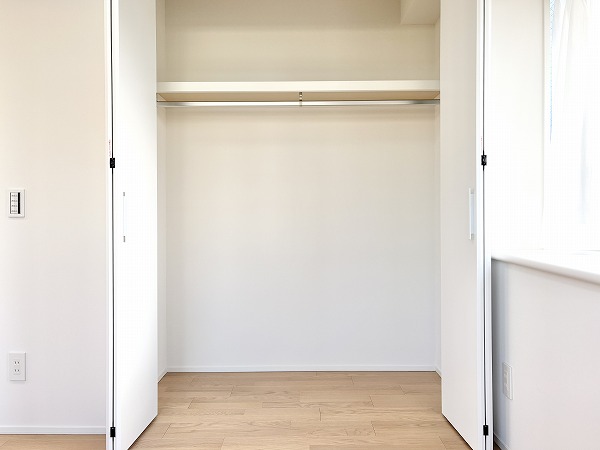 こちらは主寝室におすすめの約4.8帖の洋室。2面採光につき日当たり・風通しともに良好なので、爽やかな目覚めが期待できそうです✧左側にはハンガーパイプ、右側には棚が設置されているクローゼットがあり、収納力抜群。お洋服や季節もののインテリア、小物や日用品に至るまで様々なものの収納に大活躍してくれそう。