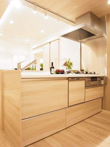 上下にたっぷりの収納が確保されたキッチン。背後にゆとりがあるので食器棚や冷蔵庫を置いても、料理中の移動がスムーズに出来ますよ。