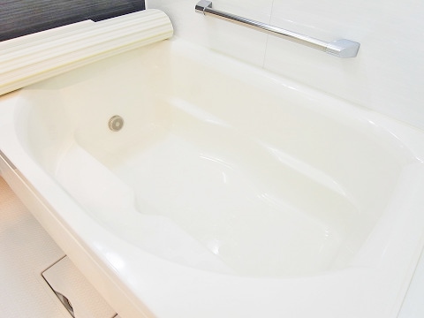 1418サイズのバスルーム。ダークトーンのパネルが照明を反射して、明るい光の中で1日の疲れを取ることが出来ます♪ベンチタイプのバスタブは、小さなお子様も一緒に安心☆