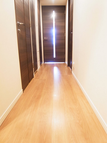 廊下は、木目調のフローリングにダークブラウンのドアが落ち着いた雰囲気を出してくれています♡有料オプションで、フローリングにはガラスハードコーティングを施すこともできるので、何年住んでも傷や変色のない廊下を保ちたい方にはオススメです。