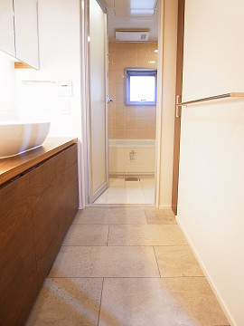 隣は、トイレと統一感のあるサニタリールーム☆シックな洗面台は、鏡下のライトのおかげでさらに洗練された雰囲気に♡