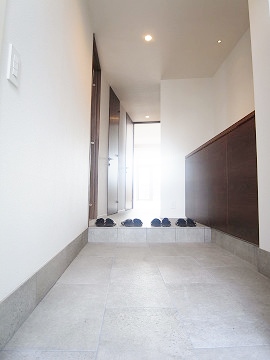 シックなデザインの中に赤のアクセントが入ったおしゃれなアプローチ♪(゚▽^*)ノ広く取られた空間は、開放感があり気持ち良く通れます☆