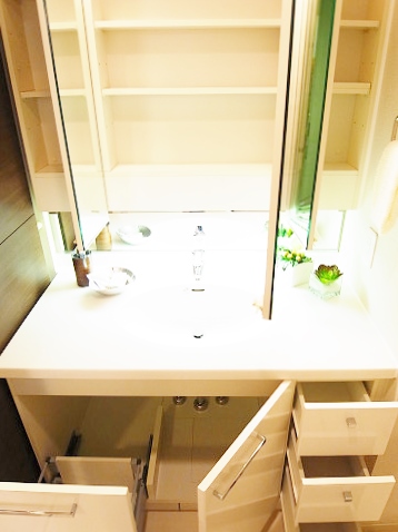 伸び伸び使える洗面台は、4面鏡が採用されて身支度に重宝しますね♬洗面台の収納は化粧品や掃除用具をしまっておくのに十分なスペースが確保されています。
