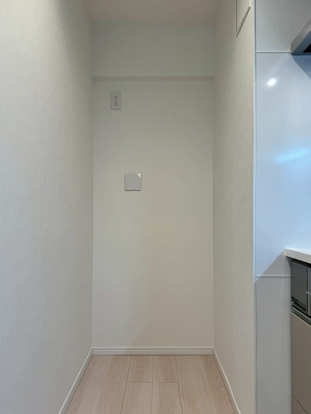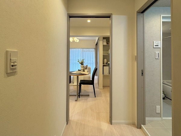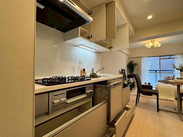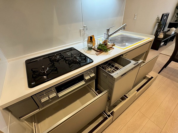 キッチンはグリル付きの3口コンロに加え、食洗機も完備されています。また、キッチンが壁付けタイプのため、リビング・ダイニングのスペースを広く確保できます。キッチンとリビングの区切りがないため、動線がスムーズで、日々の家事がより快適になりますよ。