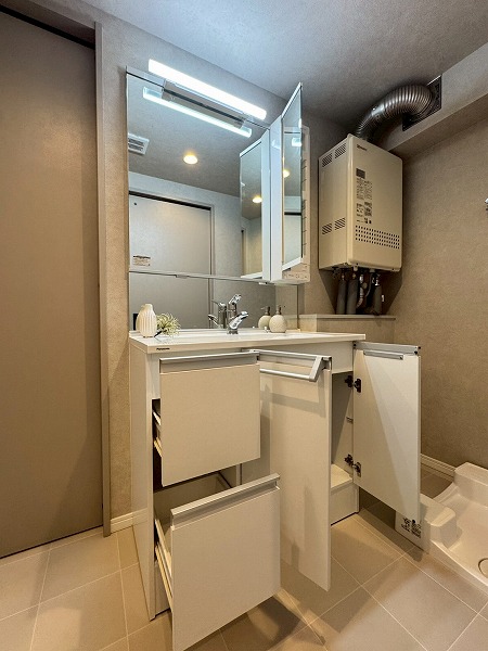 洗面所は高級感のある洗練されたデザインとなっています。ミドルミラーにより空間がより広く感じられ、通常の鏡では見えにくい角度でも身だしなみを確認しやすくなります。毎日の支度がより快適になる工夫が随所に施されていますね。