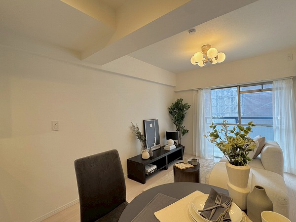 約11.3帖のメインルームは、程よいサイズ感で落ち着いた印象でした。背の低い家具を選ぶことで、より空間を広く見せることができそうです。明るい色や同系色で統一し、鏡や間接照明で奥行きを演出するのも効果的ですよ。