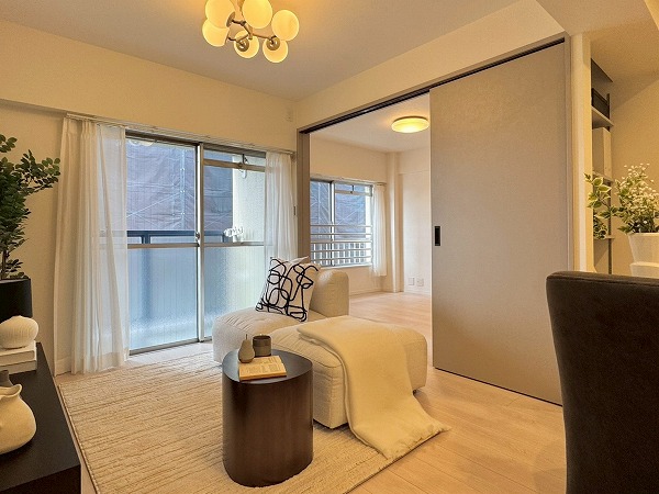 約5.2帖の洋室は、メインルームに隣接されています。リビングでのくつろぎと寝室のプライベート空間を分けることができますよ。生活のオンとオフが切り替えしやすいため、在宅ワークをされる方に特におすすめです。