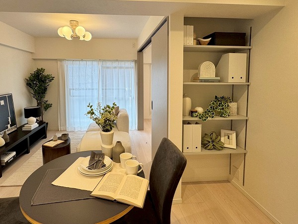 メインルームと約5.2帖の洋室には可動式の棚が備わっています。ご自身の使い方に合わせて高さを自由に調整できます。収納にはもちろん、オープンタイプの棚なので、お気に入りの小物や食器、本などを飾れば部屋に個性や温かみをプラスできますね♪