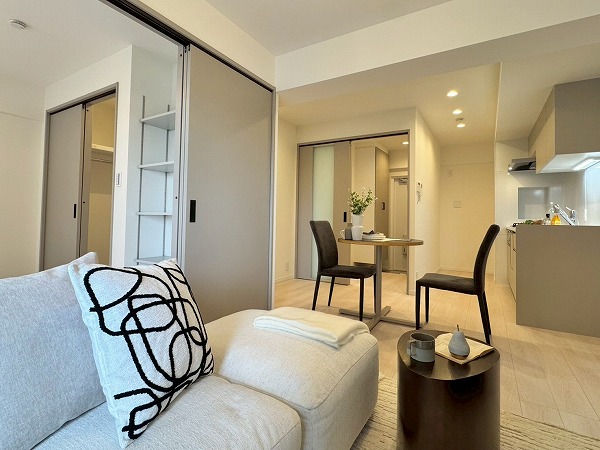 今回ご紹介するお部屋は、ウォークインクローゼット付きの1LDK。2025年10月にリフォームを終えたばかりで、新築のような心地よさが広がります。明るく爽やかなカラーのフローリングに、キッチンやドアのグレーカラーが映える、シンプルながらもデザイン性の高い空間に仕上がっていますね。