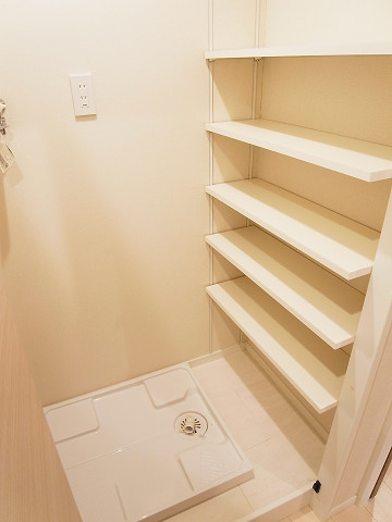 すぐ右手の折戸の中に洗濯機置場を発見♫可動棚には洗濯グッズの他、掃除グッズなどを収納してみてはいかがでしょう(*´∀`*)