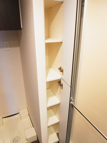洗濯機置場上とサイドにも戸棚が設置され、リネンの収納場所として利用できますよ☆