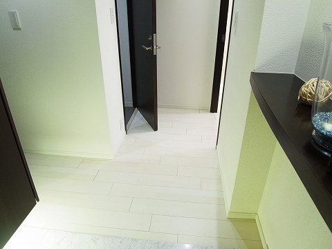 廊下奥の左手から繋がるのはトイレです♪ホワイトとダークブラウンでメリハリのついた、おしゃれな空間に仕上がっています。